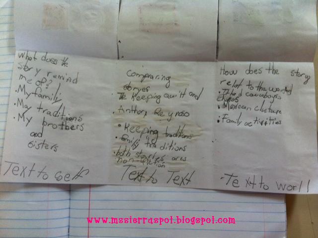 4th graders made a flapbook in order to make connections text to self, text to text, text to world.