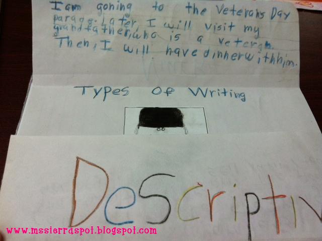 My 3rd graders started learning about elements of descriptive and narrative writing. For this activity they made a shutterfold foldable, where they had to read each paragraph and write it on the narrative or descriptive flap. Since Monday is Veteran's Day, I decided to integrate the holiday in the lesson.
