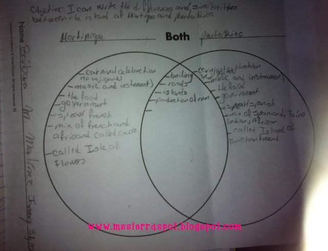 5th graders will begin to read the story "Cendrillon". In order for them to get background knowledge about the setting, Martinique, we read a selection from the textbook called "The Island of Martinique". Later, they saw a video about Martinique. They had to pay close attention, because they were going to compare and contrast Martinique to Puerto Rico. They really enjoyed the activity, and they were surprised to learn that we had some things in common to Martinique.